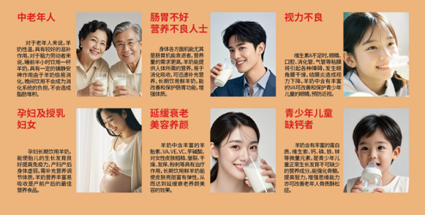 对于生长发育黄金期、学业繁重的学生群体,他们需要全面均衡的营养来支撑身体成长与高强度脑力活动。瑞康的鲜羊奶富含优质蛋白质、天然钙及易于吸收的脂肪,能有效补充基础营养;其富含的乳铁蛋白等活性物质,也有助于维持身体活力。对于消化较弱或存在乳糖不耐困扰的学生,瑞康的鲜羊奶的小分子结构,更温和、易消化,为其提供优质乳品的安心选择,助力他们以更好的状态应对成长与学业的挑战。对于学龄期,需要额外关注肠道健康的小朋友,瑞康鲜羊奶则为他们的茁壮成长构建坚实的内在防线;而对于需要补钙的中老年人、糖尿病患者,在确保核心乳品营养的同时,精准满足其对钙质增补与糖分控制的特殊需求,让健康关怀融入日常每一餐。