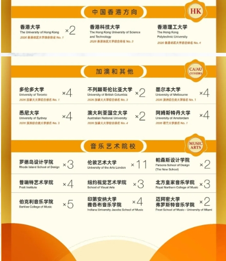 录取来自九个国家和地区,涵盖美国前十、英国G5、香港前三、澳洲前三、加拿大第一等世界顶级综合大学,以及艺术、音乐领域的顶尖学府。包括:美国新常青藤三所名校西北大学、华盛顿圣路易斯大学、约翰霍普金斯大学,纽约大学、加州大学圣地亚哥分校,英国G5名校伦敦大学学院, 香港大学,多伦多大学;以及英国伦艺,新英格兰、伯克利音乐学院的录取。
